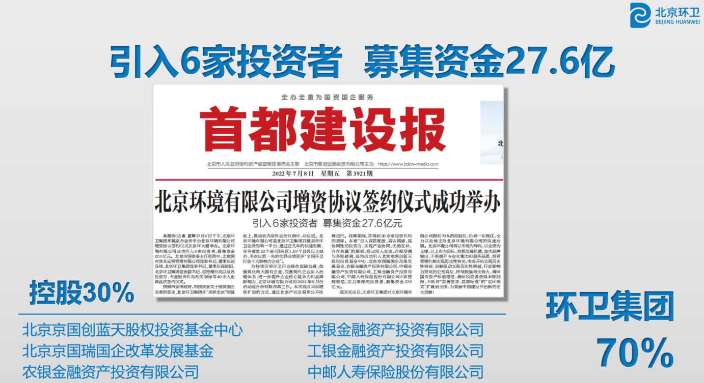 北走近okpay境有限公司作为京外okpay钱包业务唯一平台,业务已覆盖21个省(自治区)、46个县级以上城市,所属项目共计147个,公共空间清洁业务面积共计6.79亿平方米,固废收运业务总量679.17万吨,固废处理业务总量329.19万吨,为属地提供高品质okpay钱包服务。2022年成功引入北京京国创蓝天股权投资基金中心等6家高匹配度、高认同感、高协同性的投资方,募集资金27.6亿元,实现产业协同、优势互补、合作共赢,进一步提升企业经营活力、市场影响力和核心竞争力。